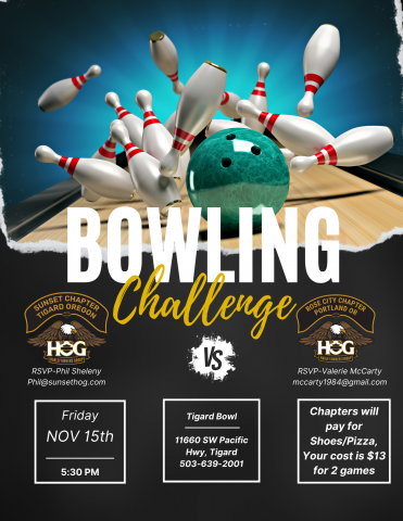 We will be bowling with the Rose City Chapter at Tigard Bowl on Friday night November 15th, 2024 at 5:30 pm. The Chapter will buy pizza and cover the cost of shoe rental. The cost is $13 for two games.